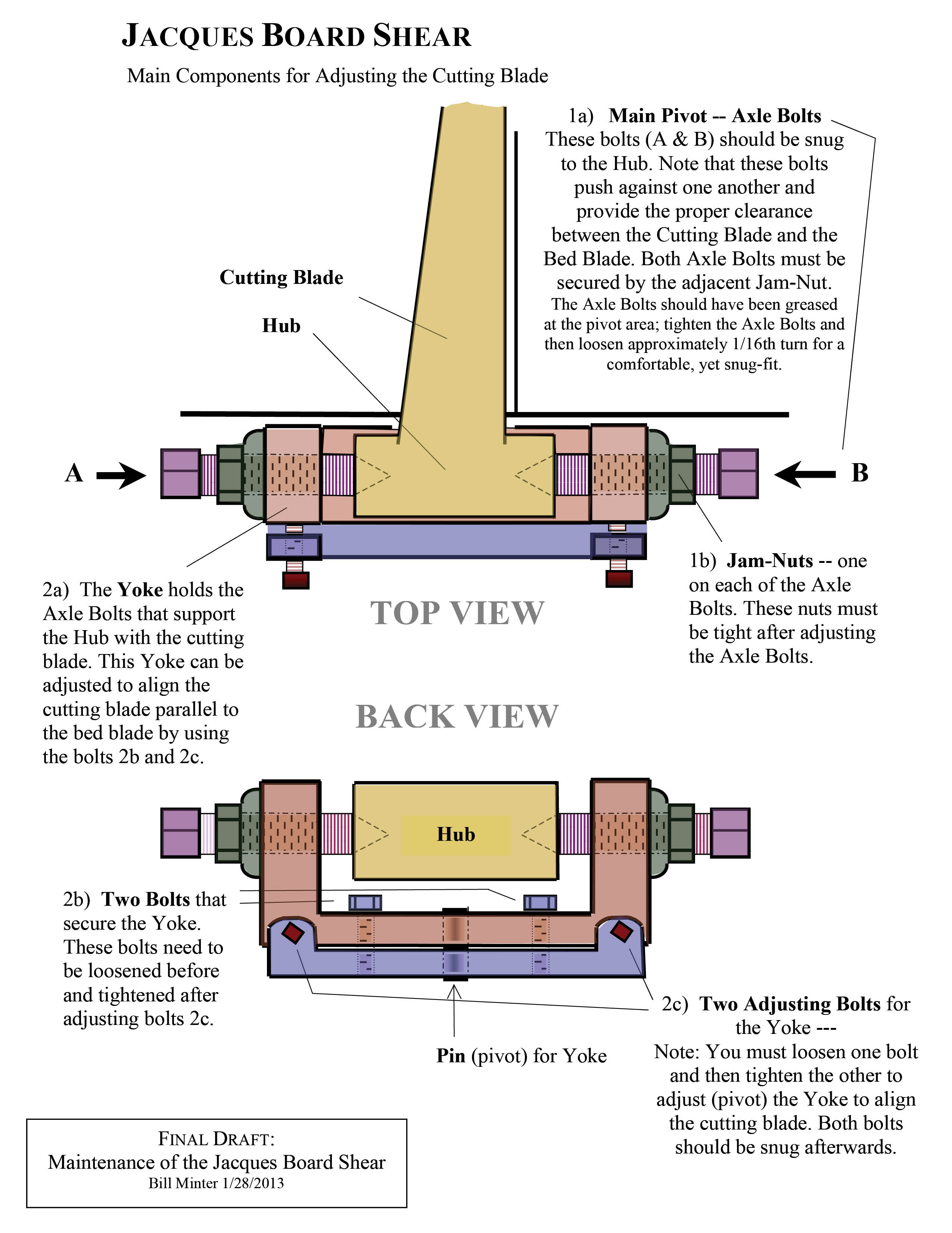 Following is a diagram of the components for adjusting a Jacques Board Shear. Note that the cutting blade is supported on a Hub that pivots between the two Axle Bolts. These Axle Bolts push against one-another thus supporting the Hub. These bolts are adjusted to provide the proper clearance between the cutting blade and the fixed bed blade. Also note that these two axle bolts must be locked or secured by the adjacent Jam Nut, otherwise these bolts will loosen when the shear is used. Another nice feature in the Jacques design is the yoke that can be rotated or pivoted by two adjusting bolts, after loosening two other bolts. By adjusting these bolts, the cutting blade is made perfectly parallel to the fixed bed blade, even after decades of use.
