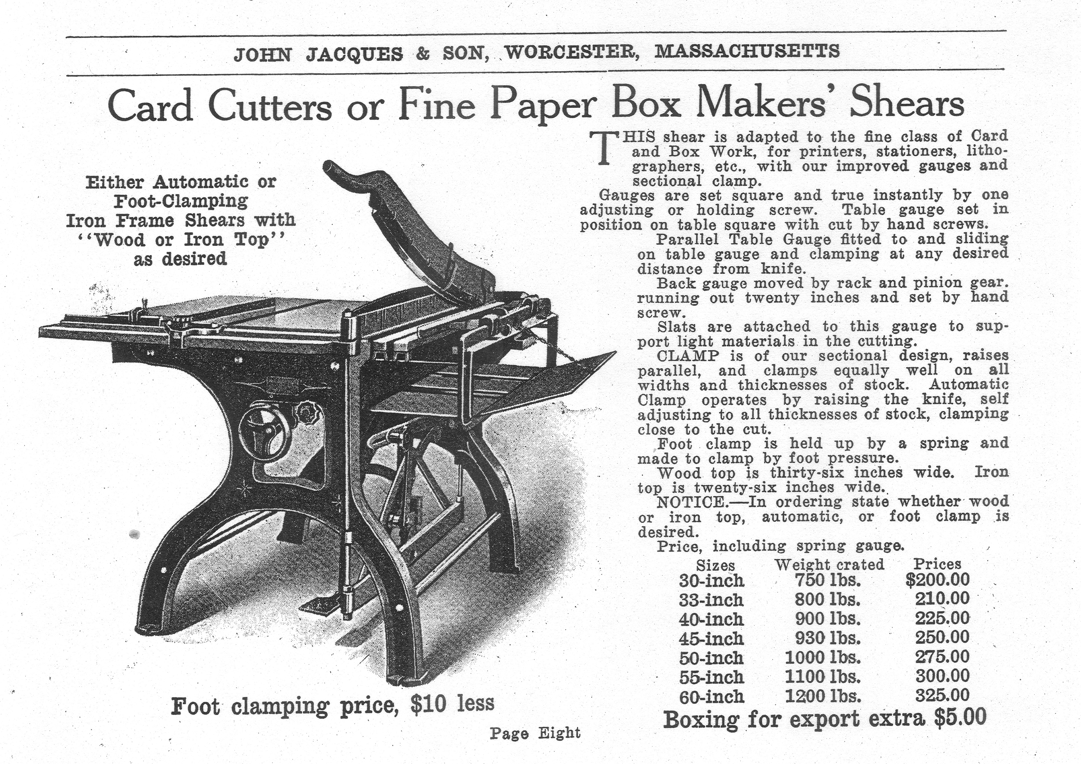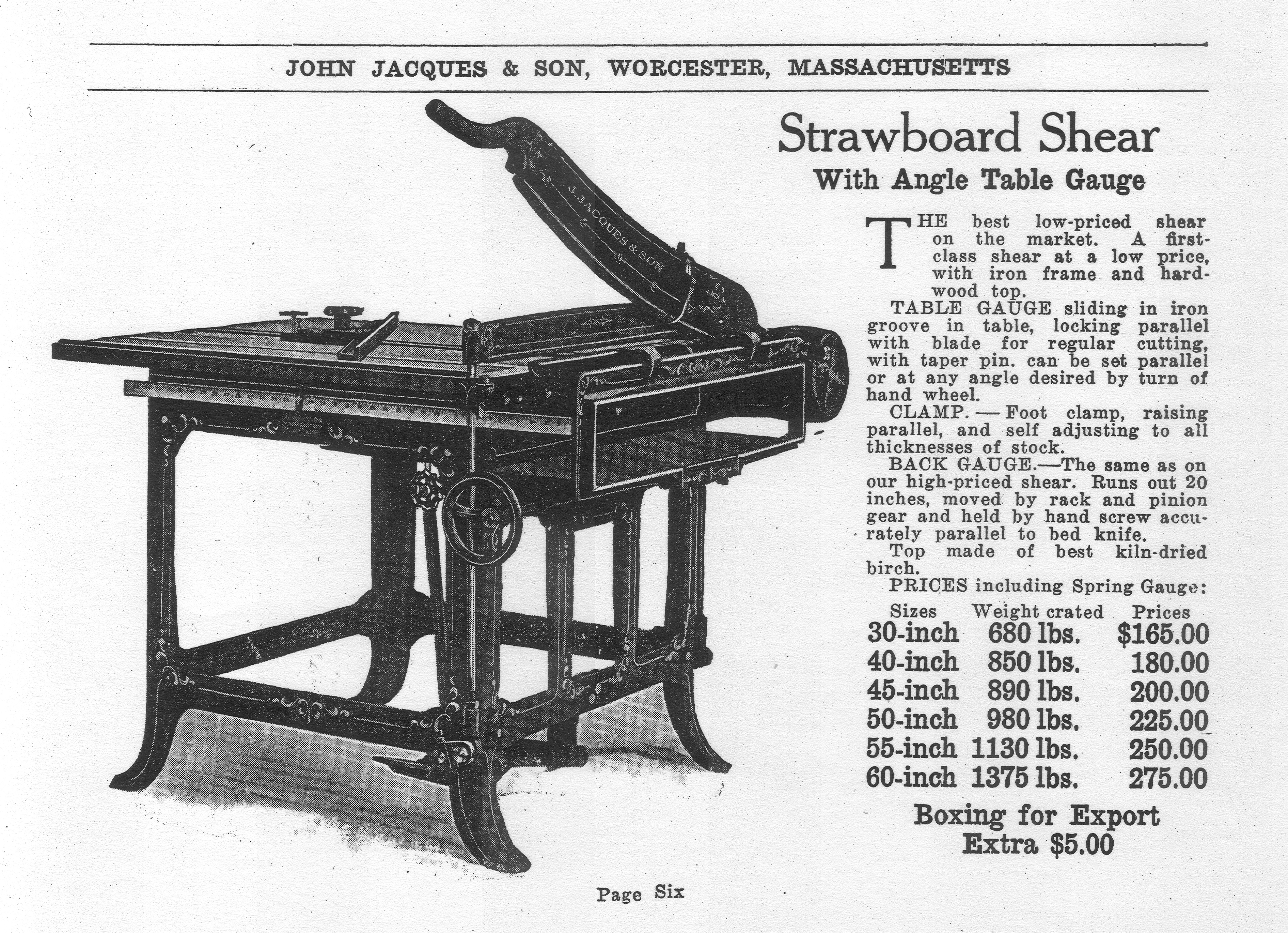 The Jacques Board Shear is available in two models: My preference is the “Iron-Top” that is described by Jacques as a “Bookbinders’ Shear.” Note that the cutting blade support of the Bookbinders’ Shear is a heavy, angular casting that is less prone to flexing during a cut. The second and very common model is the “Fine Paper Box Makers’ Shear” or the “Strawboard Shear” with a wooden top. In this model the upper blade is supported by a flat, rectangular casting that may flex during a cut.