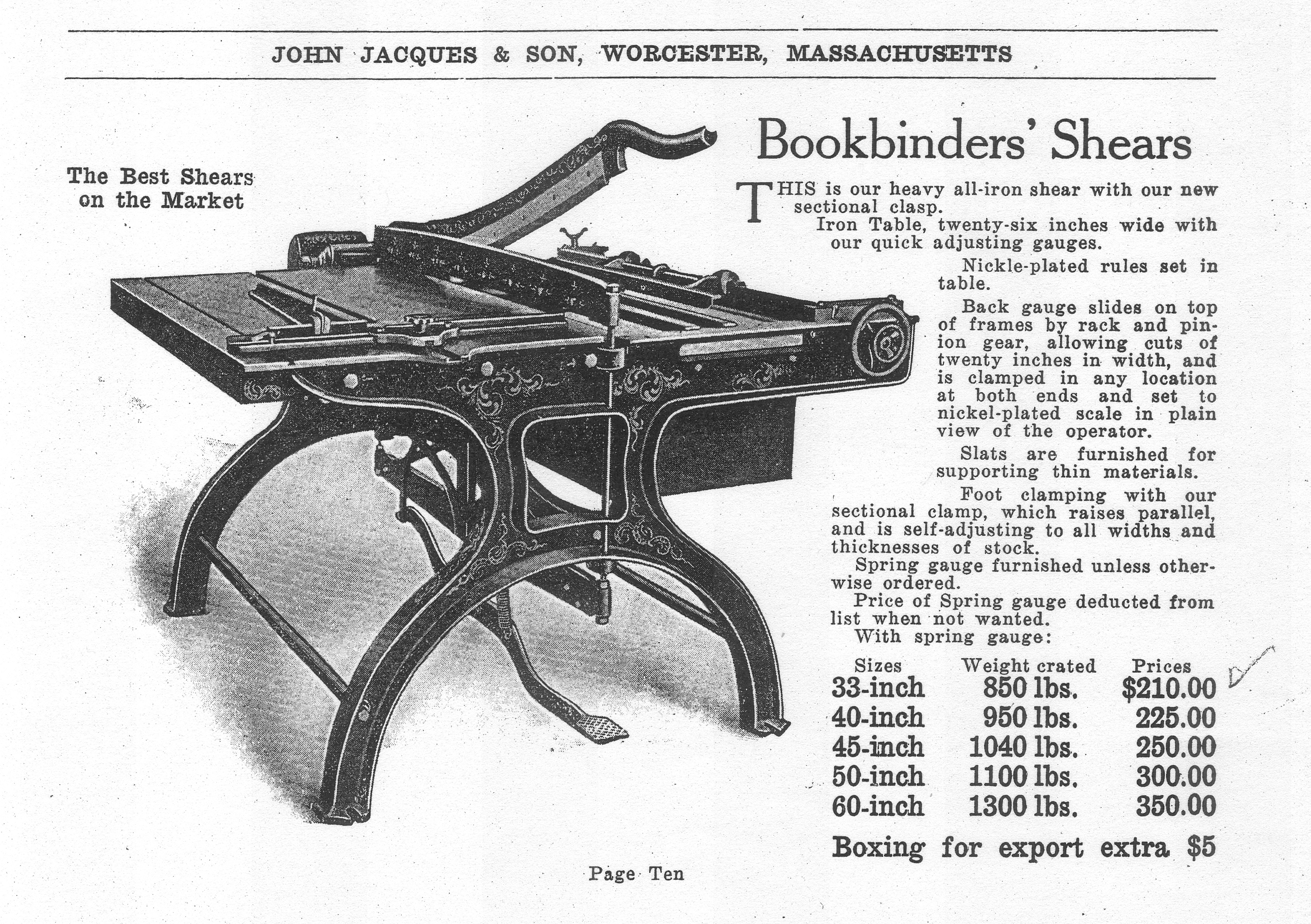 Over the years, I have had an opportunity to test the cutting action of many board shears. While some are OK, others have a major problem. Not only are they difficult to use, they could be causing serious damage to the components. And in some cases, there is a possible danger to the user. In 2000, the Guild of Book Workers produced a video on maintaining the Jacques Board Shear. That video is still available through the Guild Library. (Note: Be sure to look under the year 2000 – Salt Lake City, Utah for the “Examination of the Jacques Board Shear”.) The following information will supplement that video.
