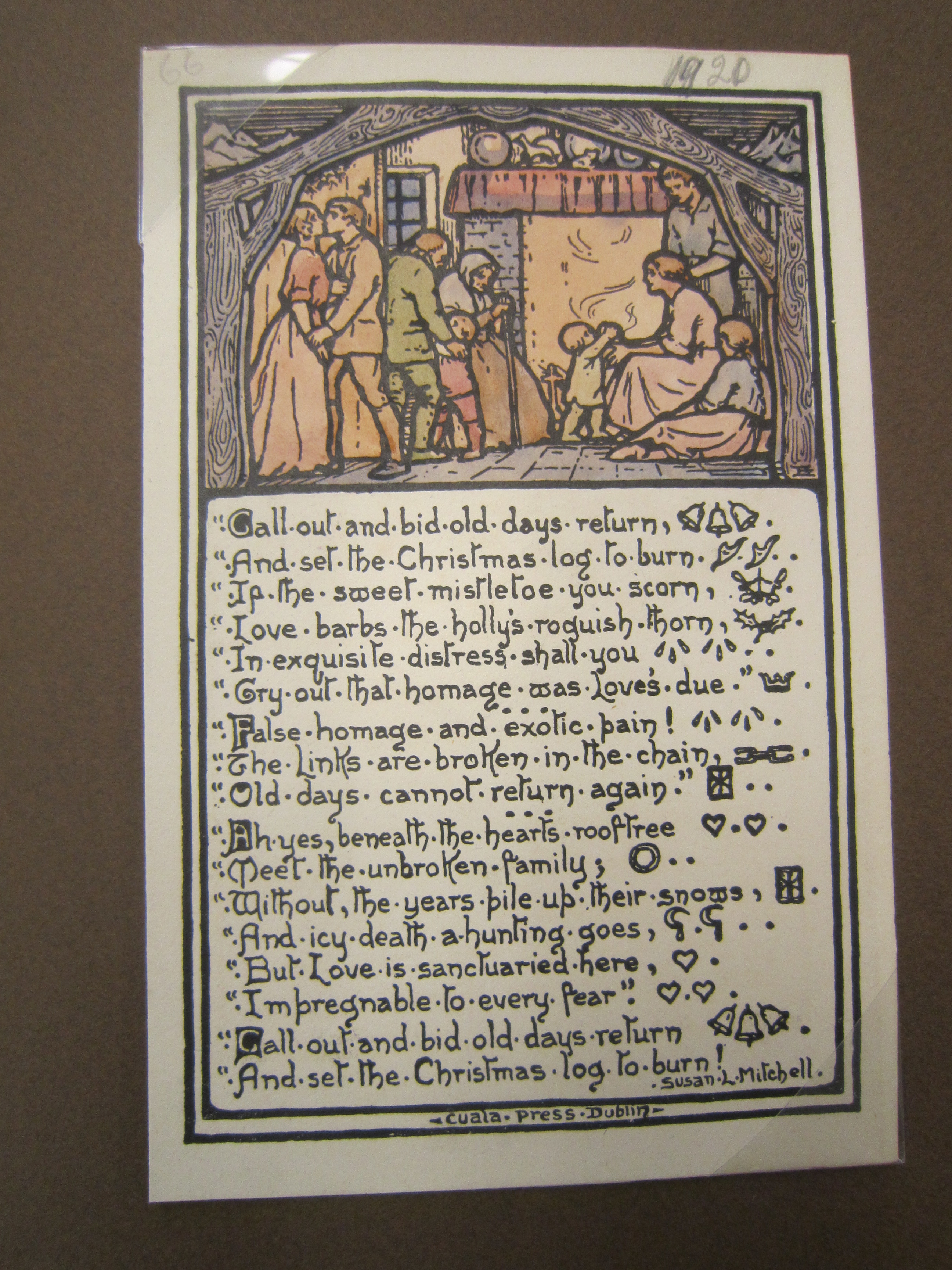 During the summer of 2010, a colleague brought me what appeared to be an old scrapbook. Inside this scrapbook was an assortment of greeting cards from approximately 1906-1946, all printed by the Cuala Press. The Cuala Press (pronounced “coo-la”) was an Irish industry that was begun by two sisters of William Butler Yeats: Elizabeth and Lillie. The Cuala Press was strongly formed in the same conceptual path as William Morris’ Arts and Crafts Movement in England, and Elizabeth Yeats actually studied with Morris. The press was all things Irish: Irish poetry, letterpress printed on Irish paper, hand-bound with Irish linen thread which was then hand-colored by Irish artists. The cards are a thing of beauty and mostly contain Irish sayings and poetry, some in Gaelic.
