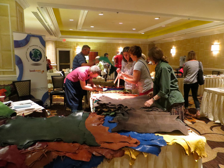 My Friday morning began with a real shopping trip to the vendor room. Armed with my mental list from the day before, I hit up various vendors and purchased many wonderful bookbinding materials including leather, a miniature book in sheets from Rebecca Press, and some small tools. I tried hard to remember that both my pocketbook and luggage were limited, but with so many wonderful papers and the ability to see skins of leather in person, it was difficult to hold back.