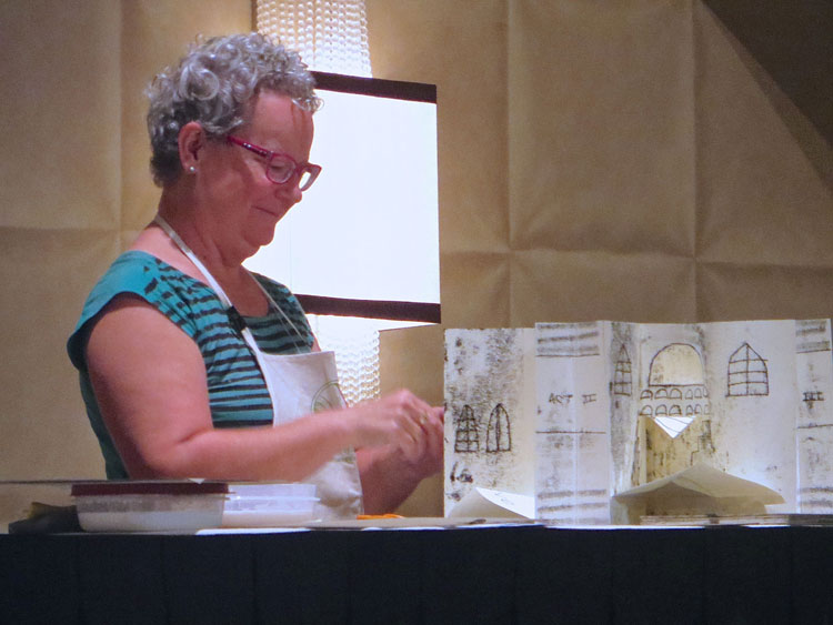 The first session of the day was led by Emily Martin, proprietor of Naughty Dog Press and teacher at the University of Iowa Center for the Book. She demonstrated how to construct a carousel book using an abbreviated version of her artist book The Tragedy of Romeo and Juliet as a model. I was particularly interested in this demo, as I have wanted to make a carousel book for a long time. Emily’s demonstration was very clear, and even included instruction on how to use the ink transfer mono-printing technique that she used to create the images in Romeo and Juliet. As a former printmaker, this was particularly interesting! For those who were unable to attend the conference but are interested in more in-depth overviews of the four sessions, keep an eye out for the next Guild newsletter. Write-ups of each of the sessions will be included!