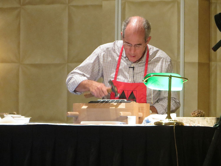 While he wasn’t able to finish the binding for us, he was determined that the audience leave with a solid understanding of the structure, working untiringly past the 5:00 end time in order to take the book through the most crucial stages. The finished books he had on display were stunning, and I left the demonstration with lofty goal of using the parchment under my bench to attempt my own model.