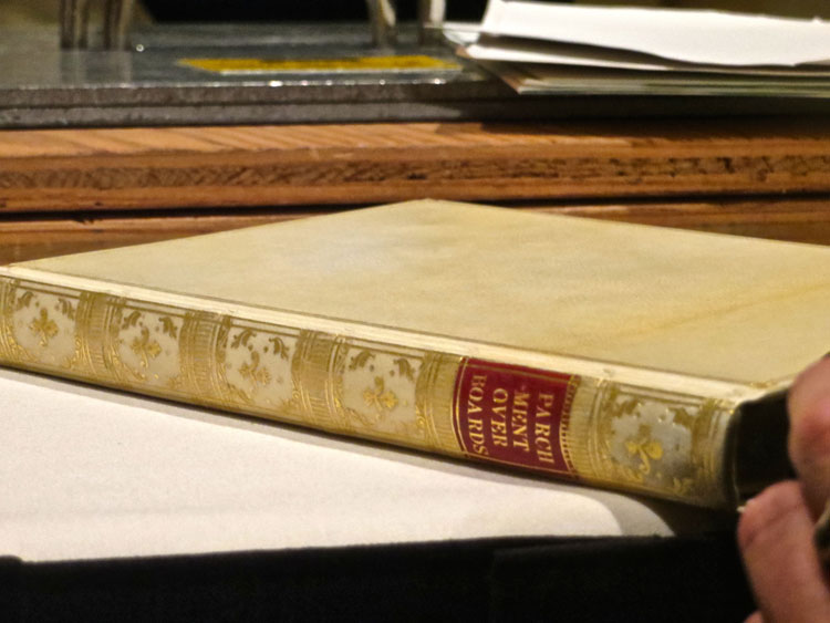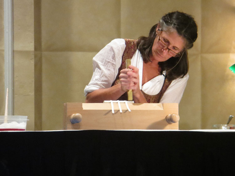 Our final session was on the medieval girdle book structure, given by Renate Mesmer, Head of Conservation at the Folger Shakespeare Library. An entertaining end to the day, we were treated to an opening trombone fanfare from Jim Croft, who was decked out in medieval-style garb. Renate and her assistant were also dressed appropriately for the subject matter.