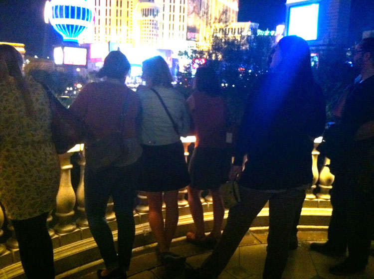 My second night in Vegas consisted of what seemed like a ten-mile walk down the strip to the Bellagio (someone said during the trip that there is probably a circle of Hell where you are forced to do nothing but walk the Vegas strip forever), where we were greeted by one of the most ornate lobbies I’ve ever seen, complete with Chihuly sculptures and talking trees. The famous water fountain show was beautiful, but completely out-done by the fire show we saw the next night at the Mirage. I will spare you all the finer details of the rest of my walk down the strip. In short: lights, dance tunes, and scantily clad ladies wherever we turned. It was a truly strange and entertaining place for the Guild of Book Workers’ conference to be held.