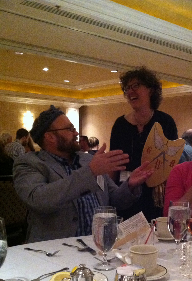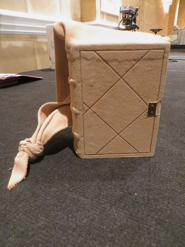 After a power nap Saturday afternoon (Vegas’s non-stop energy really took it’s toll on me!), I made my way back to the conference rooms for the closing banquet. Everyone was dressed to the nines in some sort of creative medieval-inspired costume. Chela Metzger’s hand crafted shield was a highlight, as were the knit crowns that Colin Urbina brought for the North Bennet Street School gang to wear (lovingly knitted by Caitlyn Thompson). The banquet was certainly a high point of the trip for me. It was a joy to see the American Academy of Bookbinding graduates honored, as well as the Sam Ellenport and Julia Miller for their dedication to the craft of bookbinding. The bookbinding world is full of smart, creative and hard-working people, and many of them were together in one room that night. After dinner and awards, the live auction began. As a scholarship recipient, I was required to act as one of the “Vanas,” trying my hardest to make each auction item look as tantalizing as possible. The job was not too difficult, because there were some amazing things up for bid including one of Renate’s girdle books, the abbreviated Romeo and Juliet carousel book from Emily Martin, and a book that opens up into a rechargeable LED lamp. It seems as though we did well with our Vana task, because the Guild raised a great amount of money for the Standards scholarship fund.