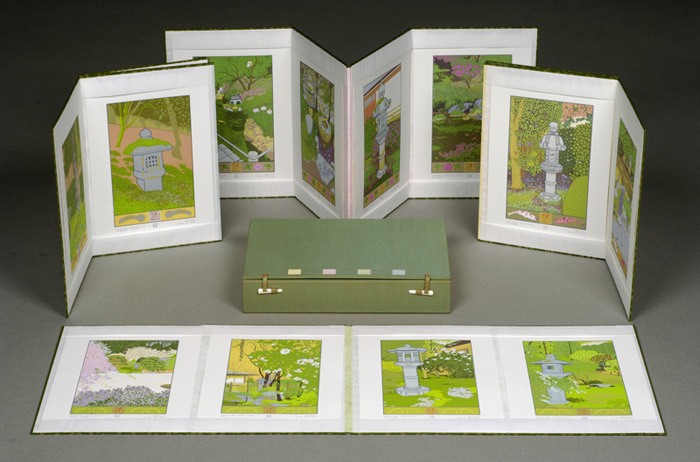 A portfolio of sixteen screenprints depicting lanterns in the Portland Japanese Garden at the four seasonal apexes, contained in four Byobu Japanese folding screens, and housed in a Shiho Chitsu Japanese four-sided case. Screen prints are original limited editions on Arches 88 paper. The Byobu/Shiho Chitsu materials are: Yuzen green/gold flowers paper, Shuji gami sumi-e paper, kozo washi, Tyvek hand dyed with FW acrylic artists’ ink, Asahi green/gold iridis Japanese bookcloth, binder’s board, bone closures. The intent is that each Byobu be a table-top displayed during its appropriate season. Created in a limited edition of ten. 21.5 x 30.5 x 5.75 centimeters. Created 2006. I have been a printmaker for over thirty years, producing a line of hand-pulled cards and original limited edition screenprints. A degree in architecture from The Cooper Union in New York City helped develop a sense of design and graphics. After years of dealing with the 2-D format, I have felt the urge to do some 3-D. This has manifested with studies in the book arts, with the original intention of producing special limited-edition portfolios for suites of prints. All along the way there has been a strong influence from the Japanese aesthetic —and that certain sense of beauty. This first appeared as my choice for thesis in college, designing and building a full-scale one room “Japanese tea house” based on traditional architecture, and I recently completed a suite of sixteen screenprints depicting lanterns in the Portland Japanese Garden, and a limited edition of ten cases for full sets. Mostly Japanese materials were used, with an emphasis on keeping with a sense of simple elegance. My explorations continue to be refined by more complex relationships within the art and craft medium, and bringing them together in obvious and unusual juxtapositions. Website at www.sueallenstudio.com. |
