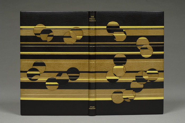 Edges gilt before sewing; sewn on five linen tapes; Japanese paper woodgrain endpapers; spine rounded and backed; laminated; bevelled boards laced on; silk endbands handsewn; covered in black, beige and yellow Morocco with inlays of same colored leathers; hand tooled and lettered with gold leaf. 31 x 21 x 2.5 centimeters. Created 2004. Born 1946, Oxford, England. Served six year apprenticeship in gold tooling. Studied under Ivor Robinson for four years. Assistant to Sydney Cockerell for five and half years. Elected Fellow of Designer Bookbinders 1972. Established and ran The Eddington Bindery for three and a half years. Taught bookbinding at Camberwell College of Art, London. Started own bindery in 1976. University of Wales, Arts Fellow, Gregynog 1982–83. First visiting lecturer at Institute of Fine Binding and Book Conservation, Humanities Research Centre, University of Texas, 1987. Currently working privately in partnership with son, Stuart Brockman. Past President of both Designer Bookbinders and The Society of Bookbinders. Accredited Member of The Institute of Paper Conservation. Lectured and taught in UK, USA, Australia and Europe. Collections: British Library, Victoria & Albert Museum, University of Texas, Southern Methodist University Dallas, Lilly Library, the royal libraries in the Hauge and Copenhagen, as well as many private libraries worldwide. Website at www.brockmanbookbinders.com.