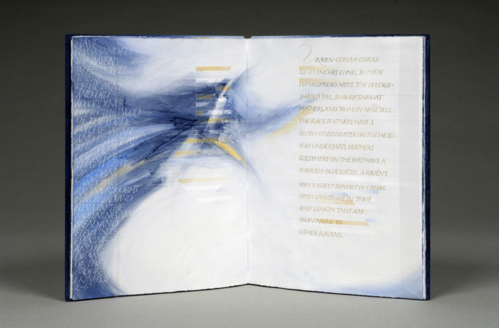 Raven is the theme. Texts are from: the Bible, mythology, Campbell’s The Masks of God, W.S. Merwin and others. A poem by myself describes the experience that inspired this book. The thirty-four pages are painted with matte acrylic and wheat paste, and lettered using metal pens, turkey and goose quills. Bound with painted boards and exposed spine. There are drawings and diagrams glimpsed through the paint. The diagrams, based on the “secret formula” used to plan pages in many medieval manuscripts, was rediscovered by Jan Tschichold. The page layouts shift from traditional to non-traditional. 32.5 x 25 x .5 centimeters. Created 2006. I focused on calligraphy, teaching and book arts after graduating from Cooper Union College of Art. My work is widely published and exhibited nationally and internationally, and is held in private and public collections including: Harvard University, Houghton Library; in special collections at Wellesley College; Reed College; Marriot Library, University of Utah; Duke University; Rochester Institute of Technology and University of Michigan. I teach workshops in the USA and Canada and at international calligraphy conferences. I spend half the year teaching and half in my studio. I love both. |