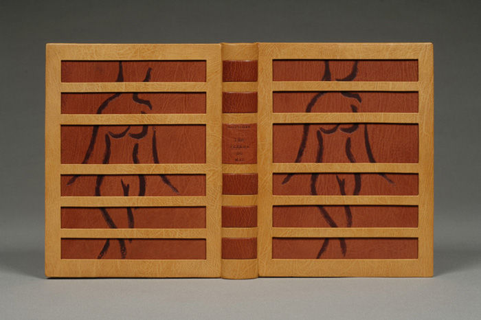 Full Niger goat skin with cut out panels, blind stamped image. Silk endbands, graphite top edge, Japanese end papers. 30 x 24 x 5 centimeters. Created 2006. Don Etherington began bookbinding at age thirteen as a student at the Central School of Arts and Crafts in London and as an apprentice at Harrison’s & Company in London. He studied bookbinding and design with Edgar Mansfield and Ivor Robinson at the London School of Printing and worked as a conservator for the BBC and Roger Powell and Peter Waters. From 1967 to 1969 he was a training consultant at the Biblioteca Nazionale in Florence where he trained individuals in conservation practices as part of the flood response effort. He came to the Library of Congress (LC) in 1970 with Peter Waters where he served as Training Officer and Assistant Restoration Officer. While at LC he developed new techniques for the conservation of large collections of materials and helped shape the field of book conservation. He served as Assistant Director and Chief Conservation Officer at the Harry Ransom Humanities Research Center at the University of Texas at Austin. In 1987, he joined Information Conservation, Inc. where he created a new conservation division. In 1982, he co-authored, with Matt Roberts, Bookbinding and the Conservation of Books: A Dictionary of Descriptive Terminology, the first comprehensive attempt to compile terminology from all the bookmaking and conservation fields. Etherington is highly sought after as a workshop presenter. He initiated the the Guild of Book Workers Standards of Excellence meetings in 1980 and served as chair until 1987. He is a past Fellow of Designer Bookbinders. His work is held in significant collections worldwide. Website at www.donetherington.com. |