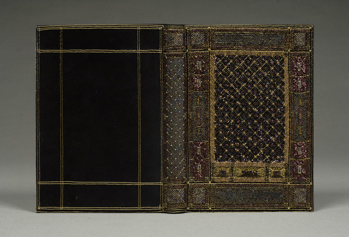 A tribute to the art and history of the handmade book, this modern adaptation of a traditional panel binding is sewn with beads into flossembroidered velveteen. The Art of the Book: A Review of Some Recent European and American Work in Typography, Page Decoration & Binding, was produced by The Studio Ltd in 1914 and was printed letterpress. Embroidered bindings represent a small but important chapter in the history of the book. This binding, produced during a six-month period that averaged two hours/square inch, incorporates Japanese, Czech, and Italian beads into a pattern of gold embroidery. 29 x 21.5 x 3.5 centimeters. Created 2006. Madelyn Garrett, BA, English, MA, Art, is the head of the Rare Books Division at the University of Utah J. Willard Marriott Library. In 1995, she organized the Book Arts Program, designed to showcase the library’s outstanding rare book collections and to integrate their use into campus curricula and the community. She has lectured extensively on the history of the book and its continuing relevance and value to modern society. She organizes local and statewide bookmaking opportunities, including classes, workshops, exhibitions, lectures, and community outreach programs. Madelyn also makes books and is the proprietor of Sub Rosa Press. Website at www.lib.utah.edu/rare. |