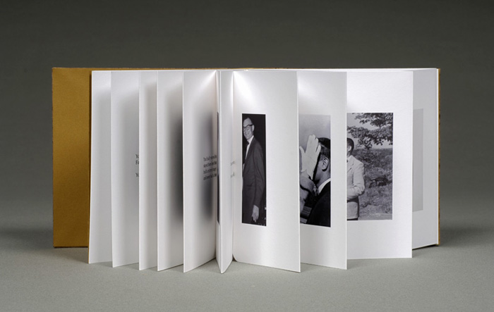 Vintage photographs and brief text document a couple’s many separations and ultimate reunion. I began Reunion shortly after the death of my father. My mother predeceased him by thirty-four years. He never remarried. I am intrigued with the idea that they are now reunited, at least figuratively, and perhaps in a more tangible form. Sewn boards binding. Pigment inkjet prints, silk brocade, goat skin. Edition of twenty-five. 18 x 19.5 x 1.5 centimeters. Created 2006. Karen Hanmer’s sculptural books and installations fragment and layer text and image to mirror the experience of personal and cultural memory. Her books are meant to be handled; the intimate scale, choice of materials, and posture and gesture required to view each piece evoke the experience of looking through a photo album, diary, or the belongings of a loved one. However, her works often take playful forms, and many include tongue-in-cheek text. She exhibits widely, and her work is included in collections ranging from Tate Britain and the Denver Public Library to the University of Vermont and Graceland. She lectures and teaches workshops on book arts and digital printing. Hanmer holds a degree in Economics from Northwestern University. She serves on the editorial board of The Bonefolder, a peer-reviewed online book arts journal, and is an officer of the Guild of Book Workers and Chicago Hand Bookbinders. Website at www.karenhanmer.com.