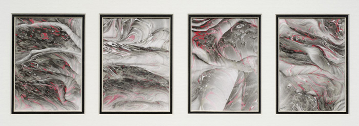Each of these papers was originally an insert used to protect the inner surface of a series of canvas picture frames I was marbling. The inserts were to be discarded. After marbling the first frame, the inner protective sheet was as interesting as the marbled frame itself. I deliberately chose a modified Spanish wave pattern to create movement and motion in the stone pattern marbling for the frames, and the organic flow of the design transferred to the protective insert sheets with even greater distortion. Acrylic colors, carragheen sizing. 51.5 x 26 centimeters. Created 2006. Ginny Kilander is a faculty reference archivist at the University of Wyoming. Her art and craft interests include both the history and modern applications of marbling, paste papers, and papermaking. Originally self-taught from accounts in books, her training was later augmented with workshops and classes. In addition to membership in the Guild of Book Workers, she is an acting advisory board member for the Society of Marbling, and a member of the Friends of Dard Hunter. |