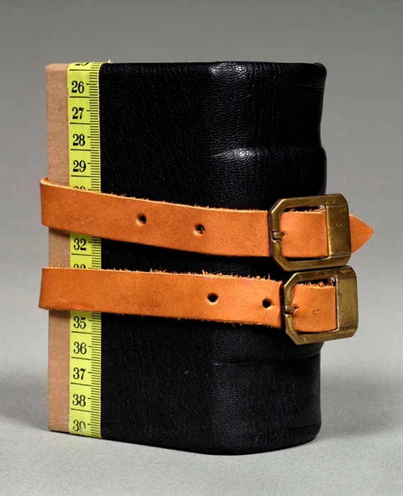 Found diet pamphlets sewn all along on handmade leather belts that run through the center of the boards, with painted text block edges and French double headbands. Covered in three-quarter leather (goat) with Fabriano Roma fore edge covers and found measuring tape. Belt closures have standard holes, as well as extra holes hand punched to accommodate the added girth of the book. Everything about the book is purposely overscaled. The resulting book speaks to the futility of the quick fix while allowing us to relate to the person who bought so many of these pamphlets, each one of which initially held great hope. 16.5 x 15.3 x 10 centimeters. Created 2006. Roberta Lavadour lives and works at the foothills of the Blue Mountains of Eastern Oregon. She made her first book in 1982 but it wasn’t until 1997 that two landmark events occurred: she got a studio of her own, and was introduced to Julie Chen, Kathy Kuehn and Barb Tetenbaum at the Whitman College Summer Book Arts program. Learning that the art pieces she had been experimenting with were actually part of a recognized medium called “book arts” was like putting fire to dry grass. Her work is fueled by her rampant curiosity and explores everything from found objects and thrift store finds to personal family history to current events. She has been recognized with awards at several exhibit venues and received an Oregon Arts Commission/National Endowment for the Arts Visual Artist Fellowship in 2001. Her work resides in many public and private collections around the world. She publishes her artist’s books under the Mission Creek Press imprint. Website at www.missioncreekpress.com.