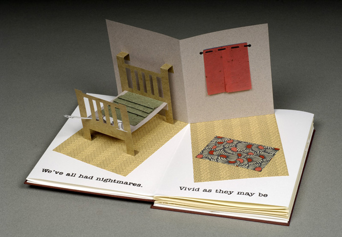 Sleepers, Dreamers & Screamers is an accordion pop-up book, printed letterpress with hard covers. The pop-ups are constructed of a variety of papers including a cotton and gampi paper made for the project by Bridget O’Malley of Cave Paper. The complete text is “We’ve all had nightmares. Vivid as they may be there is always that sweet release upon waking. But what happens when events in our waking lives surpass even our most horrific dreams. Where is our release now?” This book was begun in 2001 and derailed by the events of September 11, 2001. The text was rewritten in the aftermath and finally completed. 24.5 x 18.5 x 2 centimeters. Created 2006. Emily Martin has been a working artist since the late 70s. She earned an MFA in painting from the University of Iowa in 1979. In 1996, Emily Martin began the Naughty Dog Press, producing books using text either alone or in combination with visual imagery. Her books are in public and private collections throughout the United States and internationally, including the Metropolitan Museum of Art, New York; The Victoria and Albert Museum, London; The Marvin and Ruth Sackner Archive of Concrete and Visual Poetry, Miami Beach, Florida and others. Emily Martin teaches at the University of Iowa Center for the Book and in workshops around the country. She lives and works in Iowa City, Iowa, USA. The Naughty Dog Press is named after her dog and studio companion, Gomez. Website at www.emilymartin.com. |
