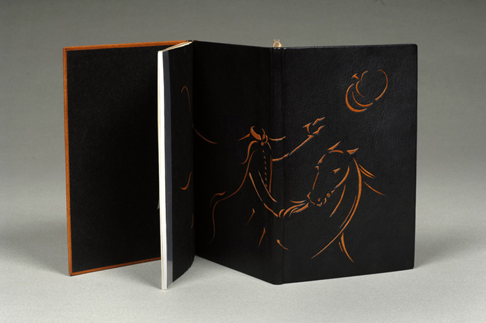 The “Two Tales” made a perfect choice for a dos-a-dos (two parts bound together, but in opposite directions). The covers are bound in black and tan goat skin with reversed color onlays and blind tooling. 27 x 18 x 2 centimeters. Created 2005. I am a senior book conservator at the Etherington Conservation Services, and co-manage the book lab. I have worked for Don Etherington for the past eighteen years and studied with Monique Lallier for three years.