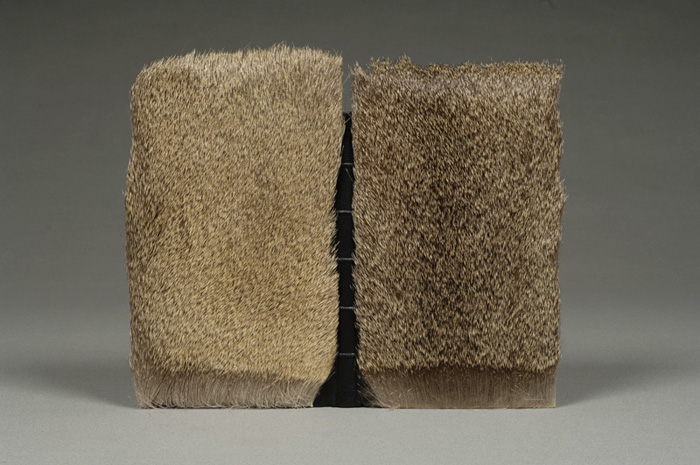 Van Dyke brown prints and letterpressed text on Roma. Spine is Clansman leather, and boards are covered in buck skin. Endsheets and pastedowns are Lokta. The text, imagery, and form describe the sensual experience of reading a physical book. Each sense is inundated as the book is held and the pages are turned. 25 x 17 x 3 centimeters. Created 2006. Marnie Powers-Torrey holds an MFA in photography and is the Studio Manager at the Book Arts Program at the J. Willard Marriott Library, University of Utah. Marnie teaches letterpress printing, photopolymer plate printing, alternative printing techniques, and other book arts for the program. She has taught classes in photography and etching for the Department of Art and Art History at the University of Utah. She prints limited edition books for the Red Butte Press. Marnie is co-chair of the Rocky Mountain Chapter of the Guild of Book Workers. Her work is housed in private and public collections in the United States. |