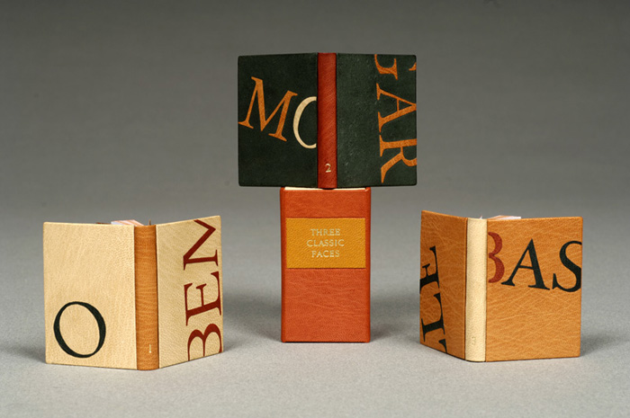 Simplifed bindings done in Oasis goat leather. Boards are wrapped in goat with leather onlays and gold foil stamping. Silk head bands and hand marbled endsheets by Steve Pittelkow. Book edges were stained. Drop-spine box is covered in goat leather and Bugra paper with a foil stamped title label. 7 x 5 x 4 centimeters. Created 2006. Jana Pullman (MFA, the University of Wisconsin, Madison) has a varied background in the arts as a printer, illustrator, bookbinder and owner of a small book press and bindery, Western Slope. She has taught papermaking and binding workshops nationally.