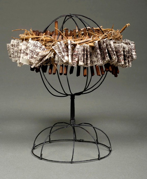 Crown of Thorns is meant to communicate the concept of sacrifice, using an easily recognizable symbol. This book was letterpress printed in an edition of three. The pages are overprinted off-register purposefully, to look as though the word “take” is being sacrificed — it’s taken away a little each page, until all you’re left with is one simple statement in red — take what you want from me, you deserve it all. The pages were then roughly trimmed and bound in piano hinge format, using acrylic stained dowel rods. A crown of thorns was attached with hemp cord and the structure is then displayed on an antique wig stand. 30 x 30 x 30 centimeters. Created 2005. Living in South Florida, I am inspired by the tropical setting and diverse cultures that surround me. My artist’s books, whether emotional or informational, aim to express and celebrate the appreciation I feel for living in such a dynamic environment. I was formally trained as a graphic designer, but studied and practiced to obtain a solid foundation of fine art skills. Bookmaking serves as a satisfying combination of my artistic abilities, wherein I am able to draw on a variety of skills — as any given book requires. A single project may use many different techniques including screen-printing, watercolor painting, letterpress printing, weaving and computer design. I find it liberating to flow through the process of creating a book, and consider form and content to be dependent on one another in order to construct a book as a cohesive communication tool. During my career as a designer, I have been honored with Communicator and ADDY awards, and was recently honored to be the recipient of the 2005 Florida Artist’s Book Prize for Crown of Thorns. I have exhibited artwork in the Bright Hill Press Word and Image Gallery in Treadwell, New York and the Bienes Center for the Literary Arts in Fort Lauderdale, Florida, and have commissioned work in homes throughout South Florida. |