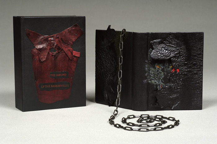 Sobota’s “three coverboard” structure. Top boards are covered with black goat skin and application of black frog skin, green fish skin and red calf skin (stomach). Middle boards are covered with green goat skin, doublures with black goat skin. Leather triple headbands. Colored edges. Acrylic painting of “beast dog” on front cover, partly covered by frog skin. Black chain is attached to the back cover. Decorative box: binder’s board covered with black leather with application of lizard’s leather. Title printed on box front’s cover. 18 x 14 x 4 centimeters. Created 2006. Jarmila J. Sobotova originally worked as a professor of psychology. During ten years of studying bookbinding as an assistant to Jan Sobota, and studying drawing and painting, she changed careers and has been working as a design bookbinder. In 1997 she received the title “Master of Design Bookbinding” from Society of Czech Bookbinders. Her work has been published in numerous journals and professional books, and is represented in many private and public collections in the Czech Republic, England, Italy, Israel, France, Netherlands, Canada, Germany, Greece, Sweden, Switzerland, Vatican, and the United States. She has exhibited in more than eighty group and twenty individual exhibits around the world and has won sixteen prizes for her work. The latest: 1999 – V. Bienale Mondiale de la Reliure d’Art, Saint Jean De Luz, France, First Prize (Cyrano de Bergerag); 2001 – VI. Biennale, Saint Jean de Luz, France, Prix de la Ville d’Urrugne (Pecheur d’Islande); 2004 – The Miniature Book Society Exhibition, Bath, England, Distinguished Book Award Winner (Christmas Carol); 2005 – MBS Exhibition, New Orleans, USA Distinguished Book Award Winner (The Cask of Amortillado); 2005 – VIII. Biennale, Saint Rémy, France, Prix de la ville de Bullion (Le Tour du Monde en 80 Jours). Website at www.jsobota.cz. |