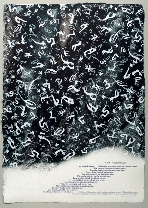 Broadside — The base sheet was pulp-painted by Claire Van Vliet with Katie MacGregor in Whiting, Maine. The night sky is letters of Hildegard’s secret alphabet silkscreened with Ellen Dorn Levitt. Edition of 100 copies. 51 x 36 centimeters. Created 2005. Claire Van Vliet was born in 1933, and in the course of her career has received many honors. She was awarded a MacArthur Prize Fellowship in 1989 and Honorary Doctorates from the University of the Arts in Philadelphia in 1993 and from San Diego State University in 2002. In 1995 she was elected to The National Academy of Design in New York City. She has been the proprietor of the Janus Press since 1955, and has also had fifty solo shows of her prints and paperworks. Large collections of her prints are held by the Bates College Museum of Art and the Boston Public Library Print Collection, and she is also represented in the collections of Library of Congress, the Victoria and Albert Museum, and the Philadelphia, Cleveland, and Montreal Museums of Art. Claire Van Vliet is represented by Mary Ryan Gallery in New York City. |