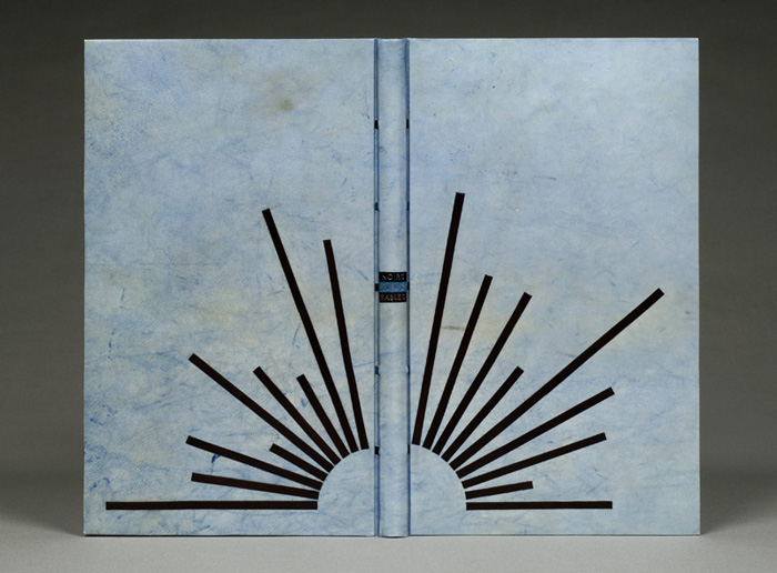 Textblock sewn on five leather/vellum slips in black, blue, and brown; graphite top edge; sewn silk endbands; case covered in full blue dyed goat vellum; leather/vellum slips laced through at joint; multicolored spine label with title in graphite foil. Leather onlays on case derived from typography of text. 40 x 25 x 2.5 centimeters. Created 2005. Began his involvement in the book arts while a work-study student in the conservation lab at the Johns Hopkins University Library. Interned in the conservation lab of the Germanisches Nationalmuseum in Nuremberg, Germany, 1984 and 1986. Formal apprenticeship in hand bookbinding at the Kunstbuchbinderei Klein in Gelsenkirchen, Germany, passing examinations in 1987. Studied at the Professional School for Book Restoration at the Centro del bel Libro in Ascona, Switzerland in 1987. Mellon intern in book conservation at the Folger Shakespeare Library, 1988. Worked in Chicago with Heinke Pensky-Adam at Monastery Hill Bindery and as assistant conservator to William Minter. In 1991 he began work as assistant conservator at the Yale University Library. In 1993 he became rare book conservator at the Cornell University Library, before establishing the rare book conservation lab at the Syracuse University Library. He is current Exhibitions and past Publicity Chair for the Guild of Book Workers. His bindings have been exhibited widely with the Guild, its regional chapters, and in invitational and solo exhibitions throughout the USA and abroad. In 1994 he founded Book_Arts-L, shortly thereafter the Book Arts Web, and most recently the Bonefolder: an e-journal for the bookbinder and book artist. Website at www.philobiblon.com. |