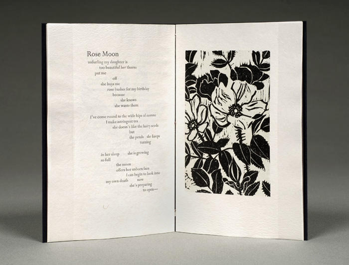 Poetry — twelve poems, twelve woodcuts, thirty-two pages — printing, binding, and papermaking by Robert Walp. Each of the twelve poems in The Moon Rose takes its title from one of the many folknames for the twelve full moons of the year. The poems and woodcuts reflect the changing seasons and the experiences of a woman traveling through first loves, marriage and motherhood. Printed from handset Perpetua type on handmade cotton/linen rag paper. The pages are sewn into a paper jacket of Arches Cover Black paper with colored linen thread. The book is protected by a wraparound case covered in black Asahi bookcloth. 23 x 15 x .5 centimeters. Created 2006. Robert Walp has been printing and binding books since 2001. He is a recent graduate of the MFA in the Book Arts Program at The University of Alabama in Tuscaloosa. |