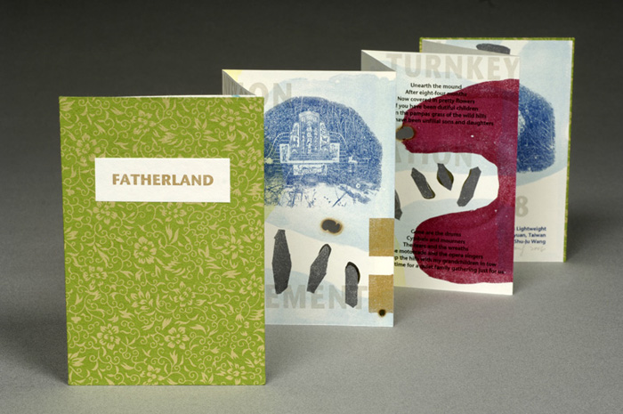 The funerary rites in Taiwan are unique within the greater Chinese culture but consistent within the context of the original Chinese immigrants who went to Taiwan — they had not intended to stay permanently. For those who were unable to return home while alive, their bones would after death. Thus evolved the burial practice — after seven years, the dead are unearthed and placed in an urn, waiting for an opportunity to return to their homeland. Written in the voice of a woman dead for seven years, Fatherland is Gocco printed and burnt on Rives Lightweight, cover in Chinese handmade paper. 17 x 89 x .5 centimeters. Created 2006. Born and raised in Taiwan, Shu-Ju Wang settled in Oregon after stays in Saudi Arabia, California, and New Jersey. Trained as an engineer, she started taking classes at Oregon College of Art & Craft (then Oregon School of Arts & Crafts), and had her first solo exhibit at the school’s Centrum Gallery in 1996. In 2000, she left the high tech industry to become a full time studio artist working in painting, printmaking, and artist’s books. With one foot firmly rooted in the Pacific Northwest and the other in the artistic traditions of East & Central Asia and the Middle East, Shu-Ju paints a portrait of her sometimes wonderful, sometimes unsettling, first generation American life. Website at www.fingerstothebone.com. |