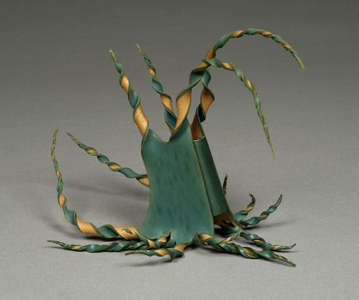 The archetype of Adam Watson’s ‘Skwirly’ books, the little dodecapod looks poised to scuttle off back to sea…. A blank book, bound in handdyed, contorted cow hide with calf spine. 30 x 27 x 27 centimeters. Created 2004. I like to call myself a maker of books, rather than bookbinder — I create books from scratch using techniques that have remained unchanged in a thousand years. I am led by my materials and what they can do: leather, cow-hide, linen, wood, paper, but nature is the foundation for my creativity. Sometimes this may be a direct visual influence, sometimes something much more subtle. I like to think there is a natural feel to my work — that the viewer will want to pick a piece up, much as one would pick up an interesting bit of wood on a walk…. Website at www.adamwatson.biz. |
