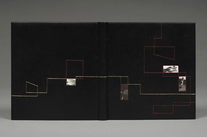 Full black leather French technique binding. Gold tooling and onlays of fine leather and engraved paper. Edge to edge doublure and suede flyleaves. 23.5 x 25.5 x 3 centimeters. Created 2006. Monique Lallier is the Director of the American Academy of Bookbinding and also teaches binding classes such as French binding and chemise. An internationally recognized bookbinder and book artist, her years of experience in the technique of French binding made her an ideal choice for director and instructor in the AAB’s French technique based bookbinding program. She began her studies in the 1960s in Montreal at Cotnoir Cappone School of Fashion and L’art de la Reliure bookbinding school with Simone B. Roy, and continued studies in Paris with Roger Arnoult, at Centro del bel Libro in Ascona with Edwin Heim and in Solothurn, Switzerland with Hugo Peller. Her work has been exhibited widely with the Guild and may be found in the collections of McGill University, Montreal; St. Joseph Oratory in Montreal for Pope Jean-Paul II; Louisiana State University; University of North Carolina; as well as many private collections in the USA, Canada, Europe, and Japan. She served as Standards Chair for the Guild for 12 years, and practices her craft full time from her studio in Summerfield, North Carolina. Website at www.moniquelallier.com.