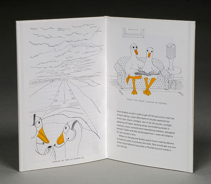 Edition case binding (bradel) covered in full Keyari paper with printed paper label on front cover. In this story, Carol’s alter ego, Frieda Fitzenmeyer, immortalizes the flying adventures of a duck named Buddy and her side-kick Percy. 23 x 15.5 x .5 centimeters. Created 1992. Carol J. Blinn was born in a small shack in 1946, to parents of questionable nature. They wrapped me in swaddling clothes and laid me in the duck house … Oh, oh, that’s not the right story. Carol J. Blinn learned letterpress printing from Harold McGrath at the Gehenna Press, in Northampton, Massachusetts beginning in 1973, and also worked with bookbinder Arno Werner, learning how to convert her printed sheets into book form. Setting up her own shop, Carol has spent the last thirty-three years designing, printing, illustrating, writing, and producing work for hire — from wedding invitations to fine press editions for clients; from diplomas to custom invitations. She offers editing services and is now concentrating on her own Warwick Press imprint in the publishing of fine and sometimes silly, beautifully produced limited edition books. Using letterpress and incorporating digital tools where appropriate, Warwick Press continues to expand and grow into the twenty-first century. Website at www.warwickpress.com. |