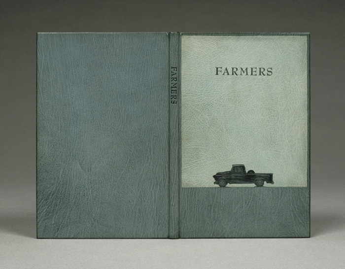 Bound in full gray-blue Harmatan goat skin; endpapers of handmade Barcham Green “Charter Oak” with sewn leather hinges; sewn on linen tapes with split boards; handsewn yellow silk endbands; Décor of light blue and gray-blue goat skin onlay with blind stamping on cover and spine. 17.5 x 7 x 1.5 centimeters. Created 1992. Sarah Creighton was born in 1948, and began bookbinding in 1979, studying bookbinding with David Bourbeau, Arno Werner, Gray Parrot, and Hugo Peller. She established her own studio in 1982, where she focuses on limited editions of private press books, one-of-a-kind fine bindings, boxmaking, and some rebinding and conservation work. |