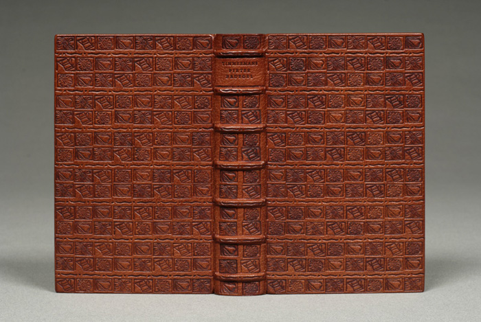 Bound in full brick red Nigerian goat with seven raised bands. Top edge gilt. Yellow silk embroidered endbands. Blind tooled utilizing tools cut by the binder. 20 x 13 x 5 centimeters. Created 1956. Lent by Don Rash. Born in Silesia (originally part of Germany; now part of Poland) in 1917, he suffered from polio at an early age, which resulted in a permanent limp. After an apprenticeship he studied bookbinding formally under Ignatz Wiemeler at the Leipzig Academy for Graphic Arts, and calligraphy under the prodigy Rudo Spemann, and later, in Offenbach, with Hermann Zapf. Following the end of the war, he walked out of the Russian occupied zone and into West Germany. There he met his future wife, Trudi Luffert, who was also a binder. In the early 1950s the Eberhardts came to Philadelphia, where he was employed by the Library Company. Within a few years they were able to move to the farm on Old Sumneytown Pike where they would cement their reputations as two of the finest American hand binders. In addition to his binding work, Eberhardt was internationally recognized for his calligraphy. Until his death in 1998, he was a continuing voice for the artistic and cultural value of bookbinding and book works, from his early dealings with the Philadelphia book world through the debates on standards and the beginnings of institutional book arts instruction, as well as a proponent of a more professional approach for our book arts organizations. Among his most noted students were Don and Pam Rash, Tony Haverstick, Bruce Bumbarger, and Jennifer Woods. |