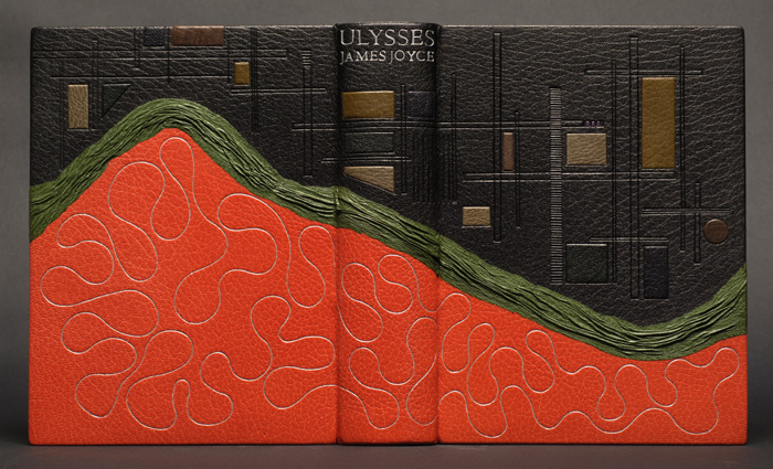 Covered in full black super Chieftain, green Oasis, and orange French levant goat skin; orange, white, and green handsewn silk endbands; décor of colored onlays with blind and palladium tooling. 26 x 20.5 x 6.5 centimeters. Created 1982. Lent by the Harry Ransom Center, The University of Texas at Austin. Don Etherington began bookbinding at age thirteen as a student at the Central School of Arts and Crafts in London and as an apprentice at Harrison’s & Company in London. He studied bookbinding and design with Edgar Mansfield and Ivor Robinson at the London School of Printing and worked as a conservator for the BBC and Roger Powell and Peter Waters. From 1967 to 1969 he was a training consultant at the Biblioteca Nazionale in Florence where he trained individuals in conservation practices as part of the flood response effort. He came to the Library of Congress (LC) in 1970 with Peter Waters where he served as Training Officer and Assistant Restoration Officer. While at LC he developed new techniques for the conservation of large collections of materials and helped shape the field of book conservation. He served as Assistant Director and Chief Conservation Officer at the Harry Ransom Humanities Research Center at the University of Texas at Austin. In 1987, he joined Information Conservation, Inc. where he created a new conservation division. In 1982, he co-authored, with Matt Roberts, Bookbinding and the Conservation of Books: A Dictionary of Descriptive Terminology, the first comprehensive attempt to compile terminology from all the bookmaking and conservation fields. Etherington is highly sought after as a workshop presenter. He initiated the the Guild of Book Workers Standards of Excellence meetings in 1980 and served as chair until 1987. He is a past Fellow of Designer Bookbinders. His work is held in significant collections worldwide. Website at www.donetherington.com. |