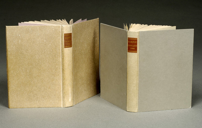 Two variations on the case binding for use in conservation. The structure replaces questionable modern leathers and vellums with handmade papers for greater permanence. Textblocks sewn using a linked stitch with pleated concertina. A hardcover and limp variety with yapp edge are shown. 19.5 x 14.5 x 2 centimeters. Created 1980. Gary Frost was born in 1941, and began working at the Newberry Library in Chicago in 1969 when he joined the staff under the supervision of Paul Banks and Norvell Jones working his way up to managing the Newberry’s conservation program. In 1981, he joined founder Paul Banks as a member of the faculty at Columbia University’s School of Library Service Preservation/Conservation training, and followed it on its move to become the Preservation and Conservation Studies Program (PCS) at the University of Texas at Austin, where he remained until 1999. He also taught at the School of the Art Institute of Chicago and developed innovative new methods of treating circulating collections, which were based on early binding styles while at BookLab. A co-founder of Paper and Book Intensive (PBI) in 1983, he continues to serve on its board. In 1999, he came to the University of Iowa to lead the conservation program started by Bill Anthony. He has published numerous articles on the theory and practice of book conservation as well as the implication of digitization for reading. Website at www.futureofthebook.com. |