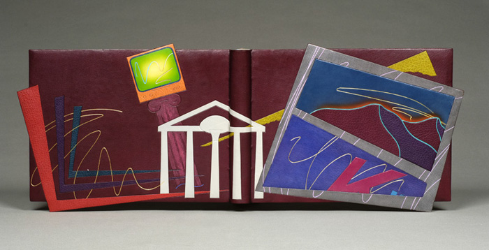 Bound in burgundy Morocco with onlays of calf, snake and goat skin. Gold, blind and painted tooling with areas of acrylic spray paint and sanded leather. Mark Beard’s story is about his youth in Bountiful, Utah. Beard remembers the K-Mart, the mountains, his tract home with the obligatory basketball hoop over the garage door, the family camper and other classic trappings of suburban life. The binding is simply an interpretation of those images. 31 x 41 x 4 centimeters. Created 1987. Lent by Earl M. Collier, Jr. Donald Glaister is a book artist now living and working on Vashon Island, Washington. He began his bookbinding career after taking degrees in painting and sculpture from San Jose State College in California, and studying binding privately with Barbara Hiller in San Francisco, and Pierre Aufschneider and Roger Arnoult in Paris. His over twenty-five year professional career in design bookbinding has centered on the exploration, development and use of unexpected binding materials, visual humor, and spontaneous expression, while working within the classical framework of the European binding form. The main focus of his current work is the creation of artist’s books in multiple. Don has taught binding and design privately and as Professor of Book Arts at the University of Alabama. Don’s bindings appear in private collections throughout North America and Europe, and in institutional collections such as the Library of Congress; the Lilly Library at Indiana University; the Ruth Mortimer Collection at Smith College; the Bridwell Library at Southern Methodist University; the Houghton Library at Harvard University; the Cornell University Library; the James S. Copley Library in La Jolla, California; the Pierpont Morgan Library in New York; The National Library of the Netherlands; and The British Library. Website at www.foolsgoldstudio.com. |