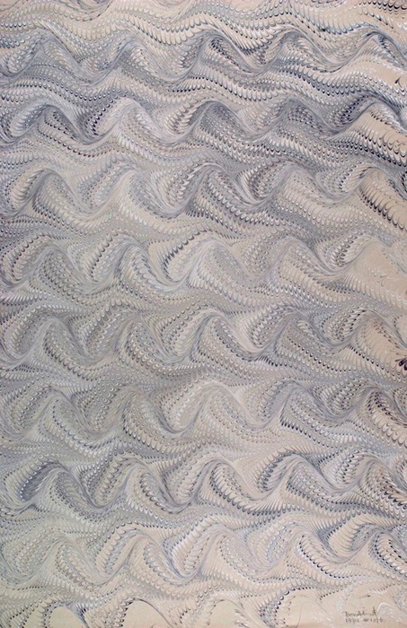 Western marbled paper executed using Colophon Water Color Marbling Inks on carragheenan medium and transferred onto Rives Lightweight gray paper; number one in an edition of six, meant to be exhibited side by side to show consistency of imaging. The degree of consistency exhibited on one’s marbled paper is the degree of mastery of the craft the marbler may claim. Since the viewer of this piece will not have the advantage of seeing the remaining five, they will be left wondering whether this particular marbler achieved the mastery sought. Having the full advantage of seeing all six sheets of the edition, the marbler can truly say that he shares in their wondering. 70 x 48 centimeters. Created 1994. Don A. Guyot was born in 1944. Following college, Don Guyot completed a master’s degree in librarianship and began working at the Seattle Public Library. Intending to become a rare book librarian he completed a second master’s degree in ancient Greek history at the University of Washington. After becoming interested in and diverted by hand bookbinding, he left librarianship and opened a repair bindery in Seattle. He learned to marble paper largely on his own because he could not find the papers he wanted to use in his business, and began teaching workshops throughout the country. In addition to Western-style marbled papers, he also excelled in the art of suminagashi, an ancient Japanese technique of decorating paper by floating inks on water. A long-time member of the Guild, he also served as Vice President-at-Large. |
