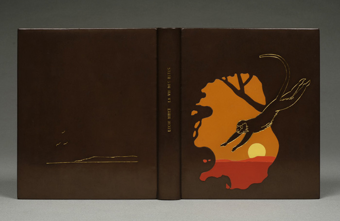 Bound in dark brown box calf; gray suede leather doublures and flyleaves; edges gilt in the rough; handsewn silk endbands; tooled and titled in gold with red, orange, and yellow box calf onlays. The binding was designed by Gerald Urquhart. 28 x 24 x 4 centimeters. Created 1977. Lent by Francine Penny Patterson and Ronald H. Cohn. Born in Illinois in 1927, Barbara Fallon Hiller studied with Peter Fahey in San Francisco, and with Constant Dreneau, Jules Fache, and Louse Gallier in Paris. She lived and taught bookbinding in San Francisco. Among her students were Don Glaister, Constance Hunter, Eleanore Ramsey, and Jeannie Sack. She died in 1989.