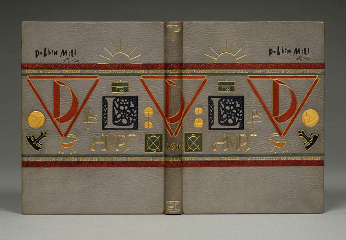 Bound in full gray Oasis goat skin; pastedowns of Dieu Donné “antique linen” with Nancy Pobanz’s “pampas grass” decorative flyleaves; sewn on linen tapes; gray and red silk endbands; multicolored leather onlays with gold and blind tooling made up from watermarks of participating papermakers. 30 x 23 x 3 centimeters. Created 1996. Jamie Kamph came to bookbinding from a career as an editor/publisher in 1971 when she met and began studying with Hope G. Weil. Since 1973 she has worked as a designer bookbinder and book conservator at Stonehouse Bindery in Lambertville, NJ. She has lectured and taught at Mount Holyoke College, Princeton University, the New York Public Library, Anderson Ranch, the Princeton Public Library, and in the Princeton and Pennington, NJ school districts. Her design bindings are held in private and public collections including the New York Public Library, the Pierpont Morgan Library, Princeton University Graphic Arts Department, the University of Texas, and Southern Methodist University’s Bridwell Library. She has exhibited her work widely with the Guild and at Yale University Library, the Aspen Art Institute, the Metropolitan Museum of Art and the Grolier. In 2003, she was awarded the Helen Ward DeGolyer Award for American Bookbinding, sponsored by Bridwell Library. Her writings on bookbinding have been published in magazines and she is the author of A Collectors Guide to Bookbinding, a volume explaining to collectors the niceties of bookbinding and restoration.