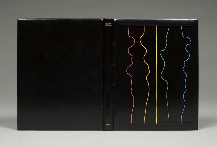 Bound in full black box calf in the French style; edge-to-edge leather doublures and flyleaves; top edge gilt; handsewn black, red, orange, yellow, and black silk multitiered endbands; multicolored telephone wires attached to front cover allowing them to be reshaped by the reader. 27 x 21 x 2.5 centimeters. Created 1986. Monique Lallier is the Director of the American Academy of Bookbinding and also teaches binding classes such as French binding and chemise. An internationally recognized bookbinder and book artist, her years of experience in the technique of French binding made her an ideal choice for director and instructor in the AAB’s French technique based bookbinding program. She began her studies in the 1960s in Montreal at Cotnoir Cappone School of Fashion and L’art de la Reliure bookbinding school with Simone B. Roy, and continued studies in Paris with Roger Arnoult, at Centro del bel Libro in Ascona with Edwin Heim and in Solothurn, Switzerland with Hugo Peller. Her work has been exhibited widely with the Guild and may be found in the collections of McGill University, Montreal; St. Joseph Oratory in Montreal for Pope Jean-Paul II; Louisiana State University; University of North Carolina; as well as many private collections in the USA, Canada, Europe, and Japan. She served as Standards Chair for the Guild for 12 years, and practices her craft full time from her studio in Summerfield, North Carolina. Website at www.moniquelallier.com.