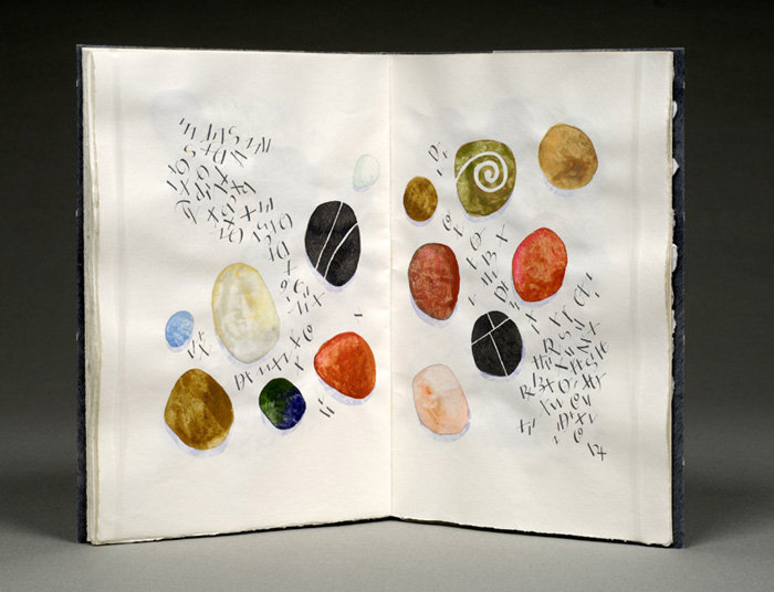 Gouache on handmade muslin paper by MacGregor and Vinzani. Sewn on vellum strips in a limp vellum binding of gray dyed goat skin. Cover decorated with woven vellum cross. Stoney Psalms contains poetry and rock illustrations by the artist describing a journey to Iona, Scotland, site of St. Columba’s early monastery. Each of the four poems dissolves and reforms, migrating with the changing stone pattern. 30 x 21 x 2 centimeters. Created 1999. Lent by Earl M. Collier, Jr. Nancy Ruth Leavitt, born in 1953, is a calligrapher specializing in hand-lettered manuscript books. Her work is represented in many prestigious private and public collections. As Calligraphy Correspondent for the Guild of Book Workers, she writes about lettering and book arts for the Newsletter. She has received several artist grants from the Maine Arts Commission for her research into the history of her craft, and in 2002 she received the Stephen Harvard Award for book design.