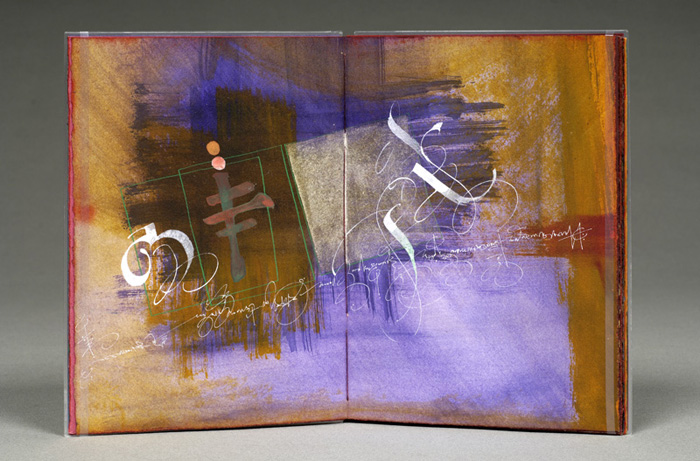 Altered traditional page design, word/image relationships, abstracted sewing diagrams and illegible calligraphic forms play on the conventions of traditional manuscript book design, content and form. Page spreads of calligraphic “messages” on saturated color fields alternate with spreads of various shades and tones of intense reds. Forty-eight page manuscript; mixed media on paper. This manuscript was the first non-verbal book created by Moore. The volume was bound by Donald Glaister, with exposed spine sewing. The covers of painted Mylar constructions of abstract “A” and “Z” were encapsulated in Mylar in the manner of modern conservation. 24.5 x 17 x 1 centimeters. Lent by the Mortimer Rare Book Room, Neilson Library, Smith College. Suzanne Moore is a painter and lettering artist whose book works explore the boundaries and links between word and image. Over twenty years, her manuscript books have investigated such subjects as Sequoyah and the Cherokee syllabic writing system, the spiritual aspects of gardening, and artists’ thoughts on creative process. As part of the Wales-based team of illuminators and scribes, she is one of two Americans creating illuminations for the Saint John’s Bible. Among the private and public collections in the USA and Europe which have acquired Suzanne’s work are the Pierpont Morgan Library, The Library of Congress, The James S. Copley Library, and the rare book collections at Harvard University, Smith College and Wellesley College.