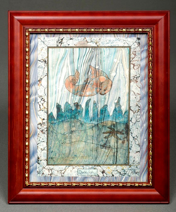 Traditional watercolor marbling, on a carragheenan bath; design completed in the ancient manner of using stencils and resists to create an image by repeatedly dipping and drying; pen and ink were used later to outline the details. 28 x 23 centimeters. Created 1989. Iris Nevins has been a professional marbler since 1978. She marbles in the traditional water based manner in use for many centuries. Her specialty is recreating early papers. She has written four instructional manuals on the art of marbling: Traditional Marbling, Fabric Marbling, 105 Helpful Marbling Hints, and Varieties of Spanish Marbling. She has also published a reprint (now sold out) of James B. Nicholsons A Manual of the Art of Bookbinding, containing eighteen original specimens of her own hand marbled paper, and has also written for The Guild of Book Workers Journal, Ink & Gall, and Marbling Bath. She has taught marbling at Peters Valley, the Center for Book Arts, the Montclair Historical Society and the Newark Museum. Currently, the bulk of her work is as a supplier of restoration style papers for hand bookbinders throughout the country and overseas. She also makes the marbling supplies, supplying watercolor and acrylic marbling colors, tools and other marbling supplies to practitioners of the art of marbling.
