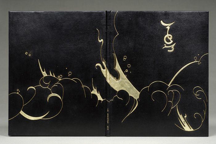 Bound in full black chagrin leather; purple endleaves; top edge gilt; handsewn purple and cream silk endband; décor of gold tooling and gold leather onlays derived from illustrations in the book. 39 x 31 x 1.5 centimeters. Created n.d. Jeannie Sack was born in 1941, and studied bookbinding with Barbara Fallon Hiller from 1977–1987, and for an intensive short period with Ole Olson in Copenhagen. She recently retired from bookbinding.