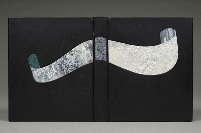 Bound in black Morocco calf with marbled paper onlays; concave spine structure; black leather endbands; silver top edge. 29 x 24 x 4.5 centimeters. Created 1997. Lent by Deke Sonnichsen. Joanne Sonnichsen was born in 1933, and after completing a degree in art and design at Stanford in 1958, she painted, studied photography, and opened her own studio in Palo Alto. In the 1970s she began an intensive study of bookbinding in the French tradition with Don Glaister and founded her own studio in Menlo Park where she practiced and taught her craft for over 25 years. Her work has been displayed in Australia, Belgium, Canada, Denmark, England, France, Germany, Japan, Russia, Sweden, and the USA. She was commissioned to design a special binding for the AIDS Names Project Book of Remembrance that is on permanent display at Grace Cathedral, San Francisco. In the 1990s she was one of the nine founders, and only American, of AIR-neuf, an international “fresh look” book arts organization based in Paris, France, speaking at AIR-neuf’s conference at Chantilly. She has served as President of the Book Club of California, the Hand Bookbinders of California, the Colophon Club of San Francisco, and was active with the Guild, the Roxburghe Club of San Francisco, the Bancroft Library Associates, and Stanford Library Associates. In 2003 she was honored by the Book Club of California with the Oscar Lewis Award for her “outstanding contributions in the field of the book arts.” Joanne died at her home, from breast cancer, on 25 December 2003. |