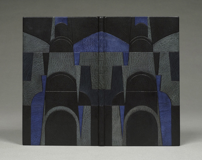 Bound in full black Oasis; gray endleaves with marbled doublure and flyleaves; décor of blue and gray leather onlays and blind tooling. 29.5 x 17.5 x 1.5 centimeters. Created n.d. Lent by The University of Iowa Libraries. Joel Spector, rare book and paper conservator, woodworker, musician, poet, apple tree planter, teacher and friend, died from cancer on June 4, 2005. Joel was a graduate of the Library School at the University of Wisconsin, Madison, specializing in Rare Books. He was drawn to book conservation, and in Iowa City, Joel became a Mellon Foundation apprentice with Pamela Spitzmueller at the University of Iowa Library Conservation Lab 1993 to 1997. He was an adjunct instructor and taught bookbinding and boxmaking for the University of Iowa Center for the Book. He also organized and taught a week long Mellon Foundation funded Workshop for Book Conservators in making sewing frames at the Conservation Department. Following his apprenticeship, he did an internship at the Folger Library and received a grant to work in the Book Conservation Department under Julian Thomas, book conservator and fine binder, at the National Library, Aberystwyth, Wales. In 1999, Joel established Hollow Wood Bindery in Peacham, Vermont, and most recently was living and working in Portland, Maine. In addition to his conservation work, Joel translated the work of Peter Huchal, Yvon Goll and other modern German poets. Special Collections at The University of Iowa Libraries recently purchased his last binding, New York Revisited, a Grolier Club edition.