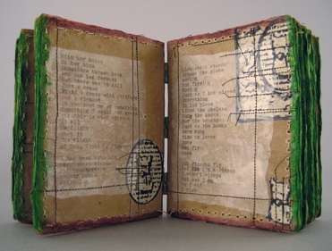 A tale of flight inspired by an old typewriter, once owned by Viola D. Pigeon, found at a junk shop in a case covered with travel stickers. Handmade kozo/gampi paper with encaustic paint surfaces, typewriting on tracing paper, and digital photos. Packed sewn on split thongs with a green, paper cover. JODY ALEXANDER has a BA degree from UCLA, Art History, and a MLS from Simmons College. She is a book artist, papermaker, book arts instructor, and librarian with a special interest in historic structures, exposed bindings, and eastern-style papermaking. She teaches regularly at the San Francisco Center for the Book and UC Extension courses. |