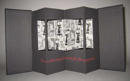 Accordion with cut, reverse folds featuring black and white photo images of Bessie Coleman, first African American to receive a pilot's license in 1921 from France after refusal to US flight schools. Hand lettering in red gouache on black, Fabriano paper, with a 1995 U.S. postage stamp of the aviatrix on the cover. 4-1/2 x 10-3/4 x 1/4" (closed) LILLIAN DABNEY specialized in calligraphy for many years before she began studying bookbinding in 1993 as an outlet for her creative lettering. "I am eternally grateful for the emergence of artist's books thus defining a whole new genre of artistic form. I am thankful as well to all the monks who created the first hand-lettered books." |