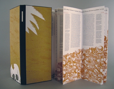 A testimony on human behavior and genocide using the story of Icarus as allegory. Letterpress printed type, photo-polymer plates and linoleum art on 80# Cougar cover paper. Accordion text unfolds from a hard cover as dramatic image of skeletons gradually fill the page. Sandragraph cover papers with skill and wing design. 5-9/16 x 15-1/4 x 1" ELSI VASSDAL ELLIS is proprietor of the Eve Press, executing book editions from the written word to designing , illustrating, printing letterpress, and binding. "When young, I tasted the fruit and escaped and imagined; later I became compelled to create fruit to inspire, to inform, to remind. I am not a media bigot but I find myself drawn to the physicality of letterpress..." |