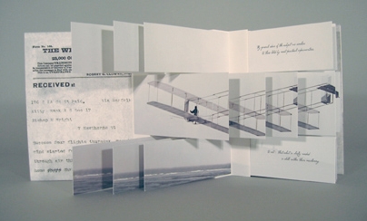 Accordion flag book with archival inkjet prints of a Wright glider biplane over the waves at Kitty Hawk, NC. Folding flag pages contain text from a letter written by Wilbur Wright outlining his plans for a motorized flying machine, contrasted by the Gershwin song, They All Laughed. KAREN HANMER is a book and installation artist, and a freelance photo researcher with a degree in economics from Northwestern University. Since 2000, she has had seven solo exhibitions and has been included in group shows at venues including The Center for Book Arts, The Society for Contemporary Photography, the Newberry Library, Minnesota Center for Book Arts, and Pyramid Atlantic, among others. |